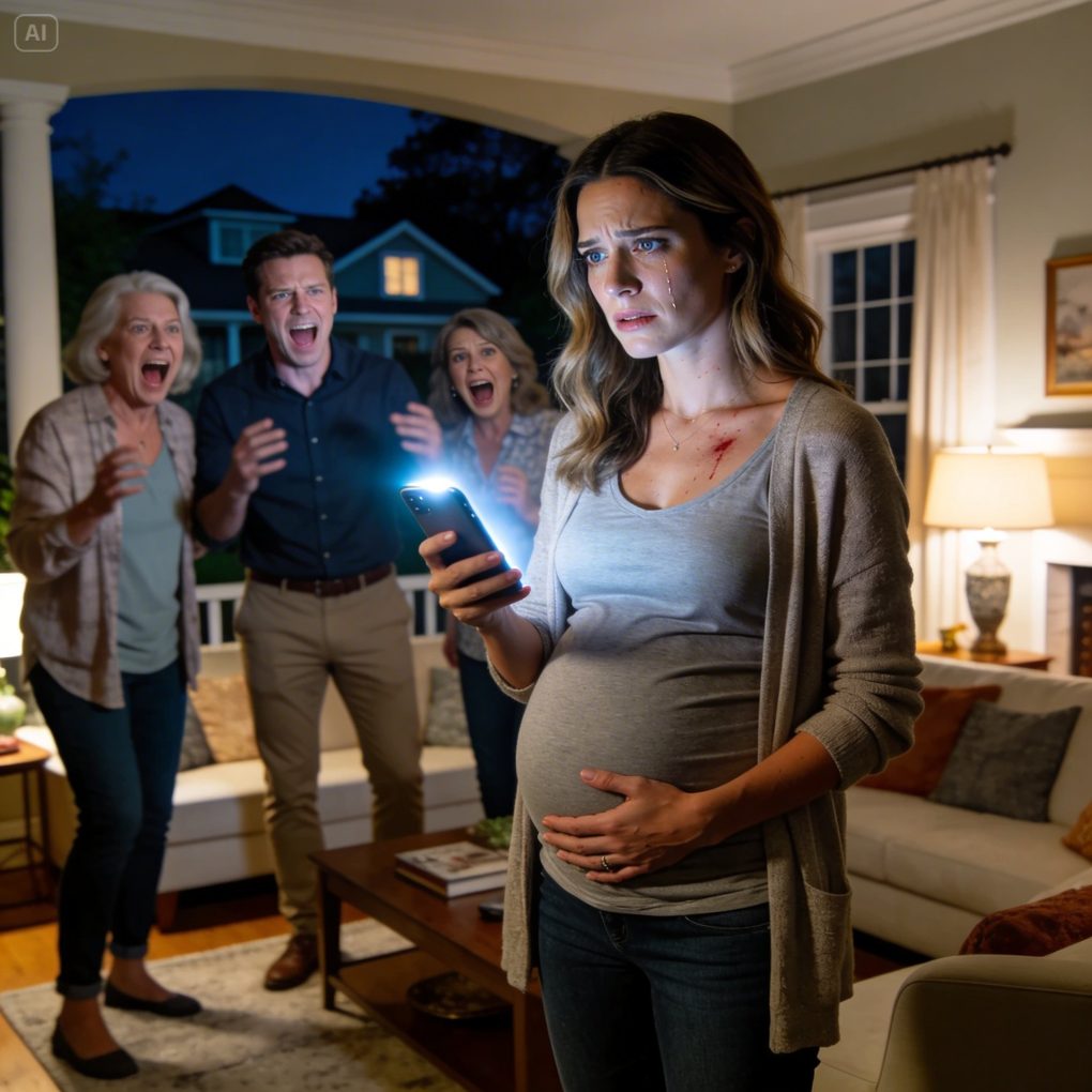 My hand went to my stomach instantly. The baby moved—a terrified hard flutter under my palm—and panic flooded every part of me. Ryan stepped closer, breathing hard, and hissed, “You will not humiliate me in this house.”